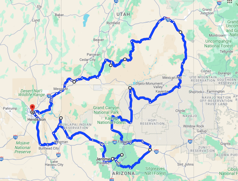 Highlights: Zion NP, Dixie NF, Bryce NP, Capitol Reef, Arches NP, Canyonlands NP, Mexican Hat, Monument Valley, Horse Shoe Bend, Red Rock State Park, Route 66, Las Vegas, Williams, Sedona….